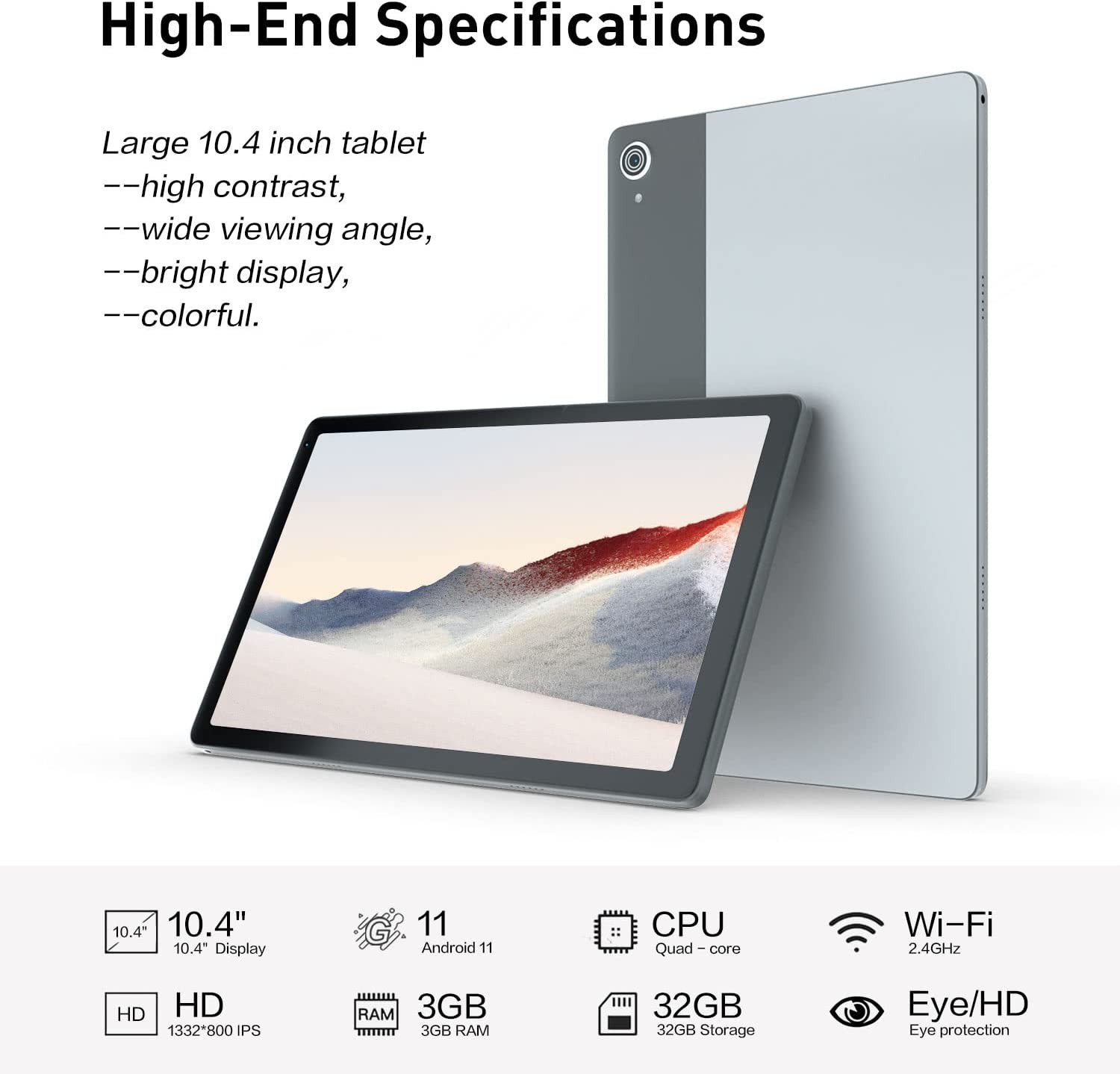 • ★【10.4" Ultra-narrow Bezel】 The 10.4" tablet uses a 1332*800 brilliant HD IPS display, metal shell, and an ultra-narrow bezel design for a higher screen-to-display ratio. Enjoy widescreen movies, videos, and games with wide viewing angles.